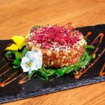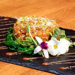 100 γρ. φρέσκο, ωμό tartar από τόνο σερβιρισμένο με σαλάτα goma wakame, προετοιμασμένη σύμφωνα με την ειδική συνταγή του Σεφ. | ||