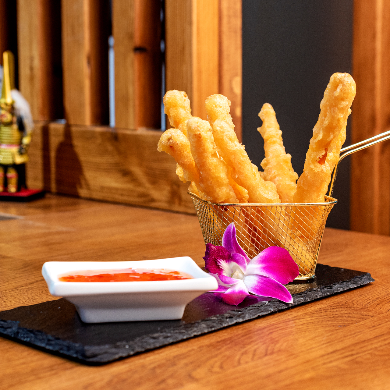 100 γρ. Τραγανό καρότο σε τεμπούρα σερβιρισμένο με γλυκιά σάλτσα τσίλι.