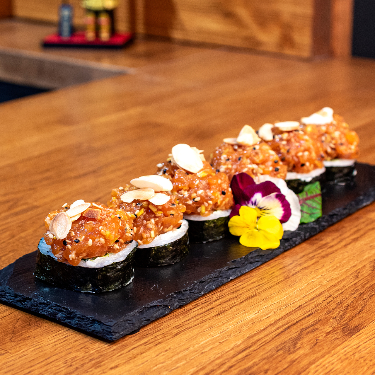 6 τεμ. ρολό με ψητό σολομό, τυρί Philadelphia και λαχανικά, σερβιρισμένο με καπελάκι από ταρτάρ σολομού.