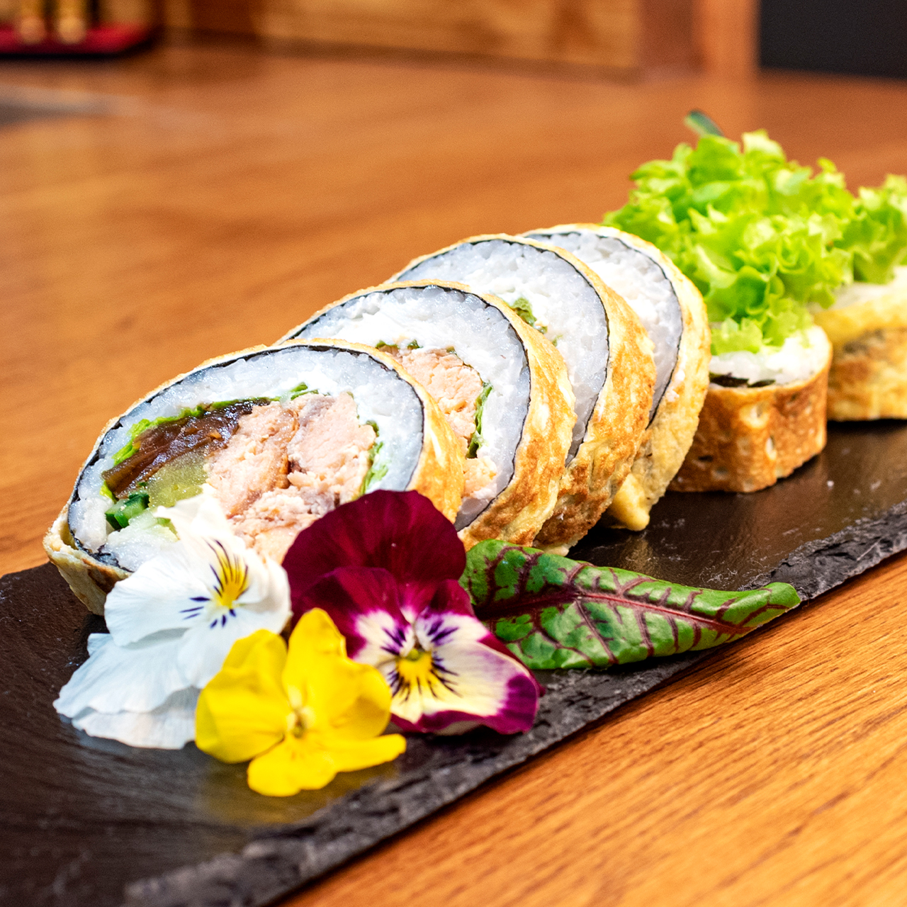 Tamago maki με ψητό σολομό, τυρί Philadelphia και λαχανικά
